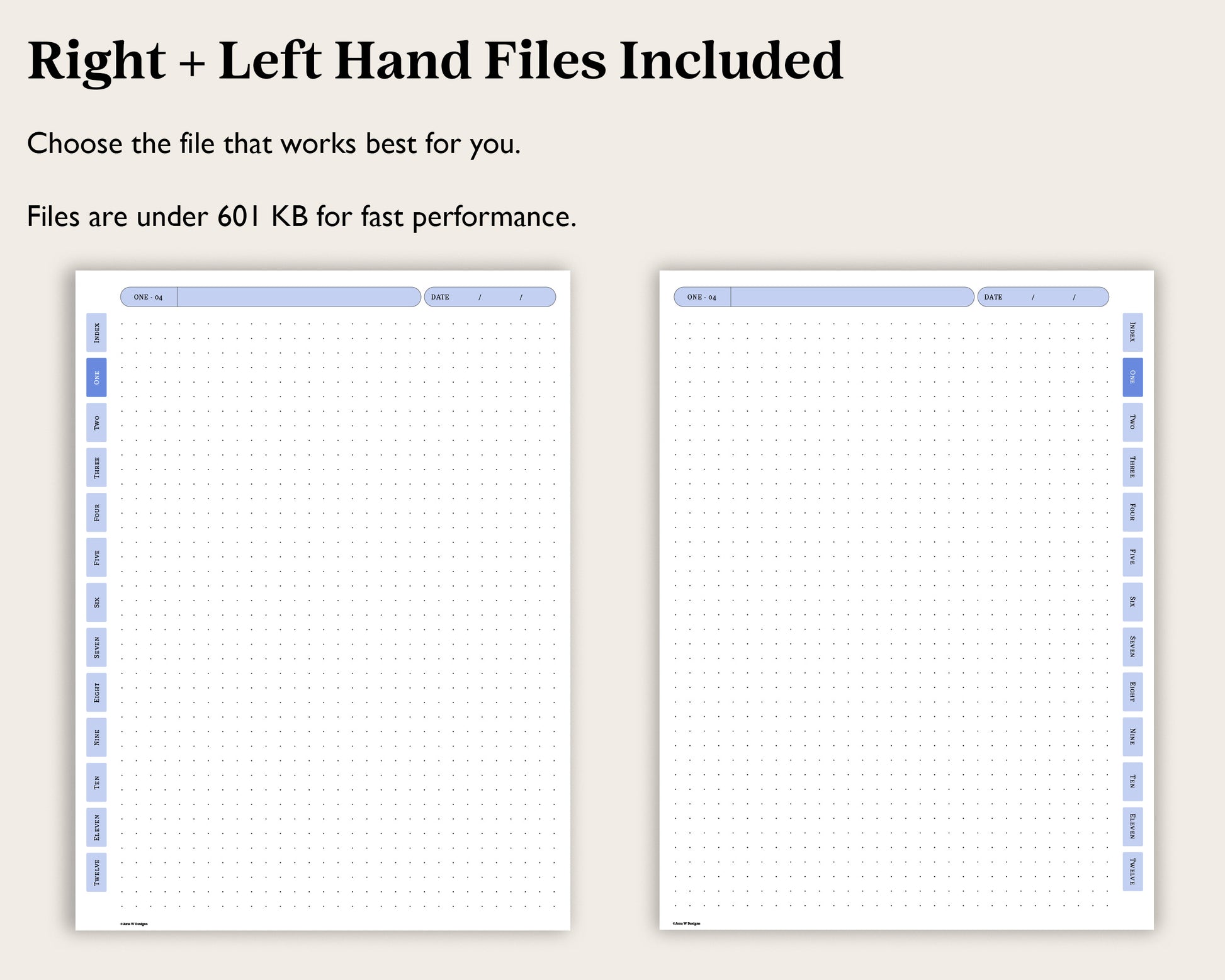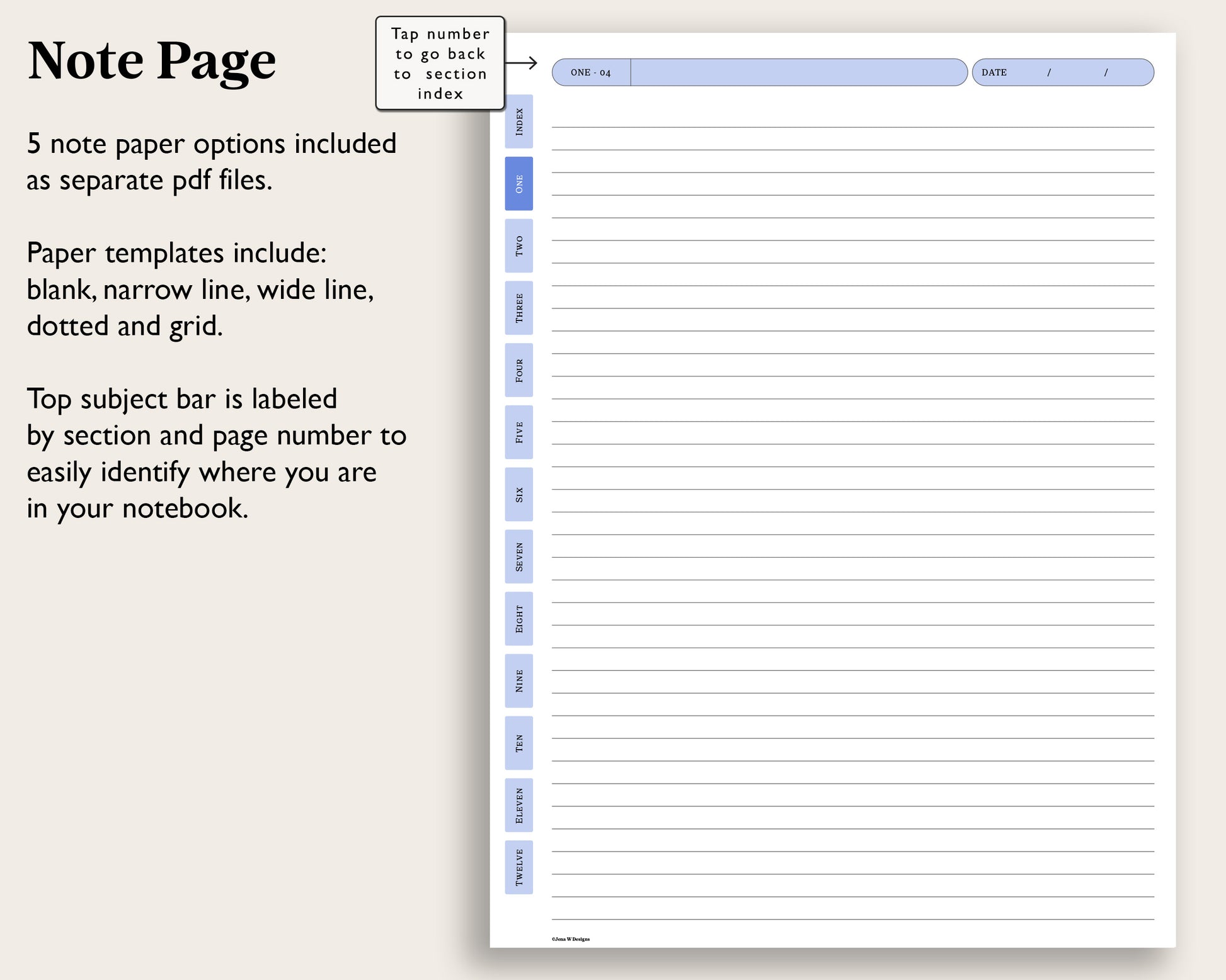 With 12 custom sections and 31 linked pages per section, you'll have 372 pages to capture your ideas with ease. Choose from five paper templates (blank, narrow rule, wide rule, dotted, and grid) to match your note-taking style. Each section is clearly labeled and designed for fast, seamless navigation, ensuring you stay focused on what matters most.