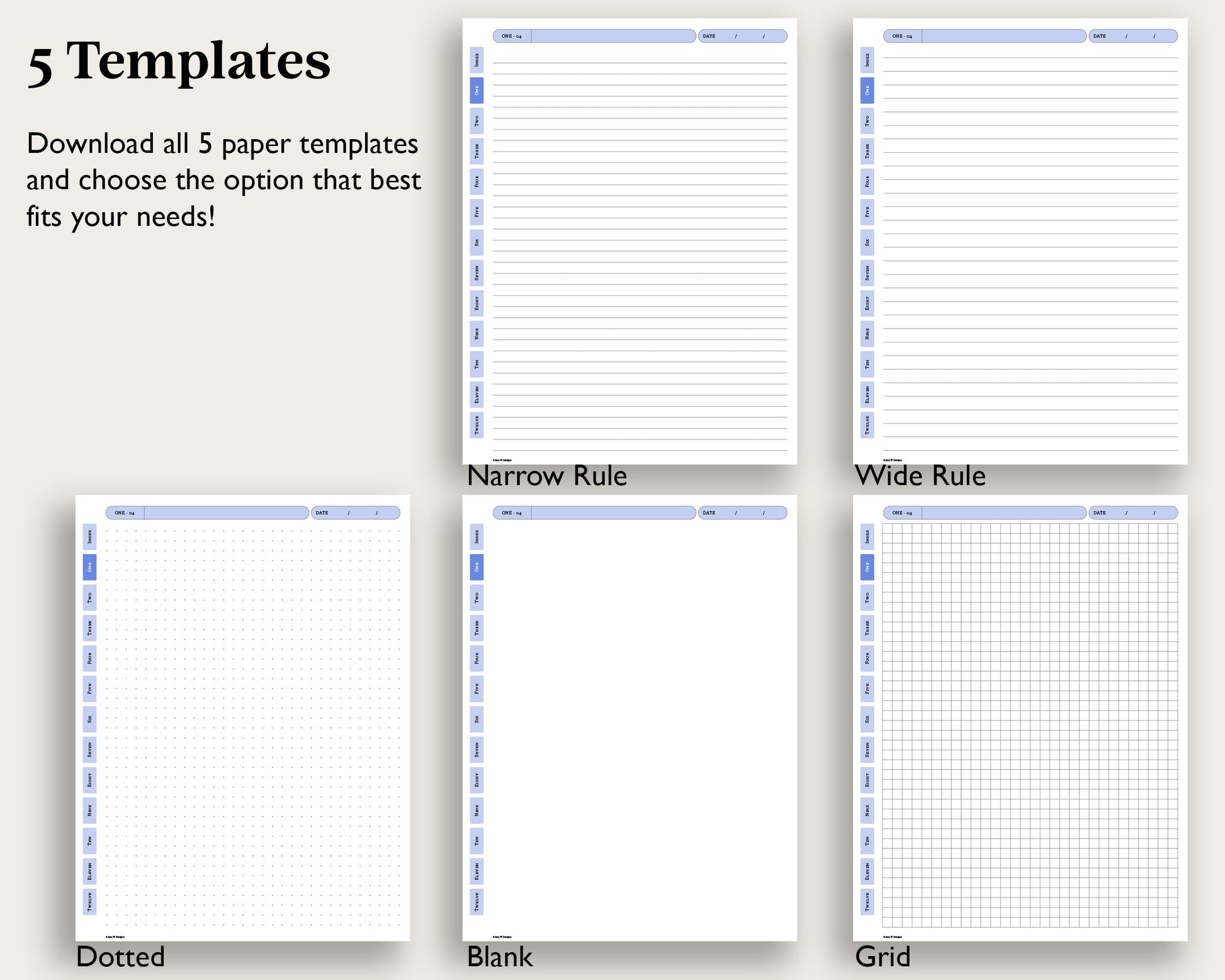 - 5 Paper Templates – Blank, narrow rule, wide rule, dotted, and grid