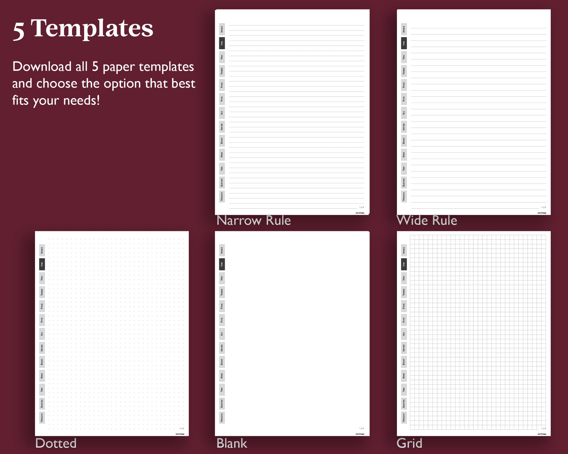 - 5 paper templates to choose: blank, narrow rule, wide rule, dotted, & grid