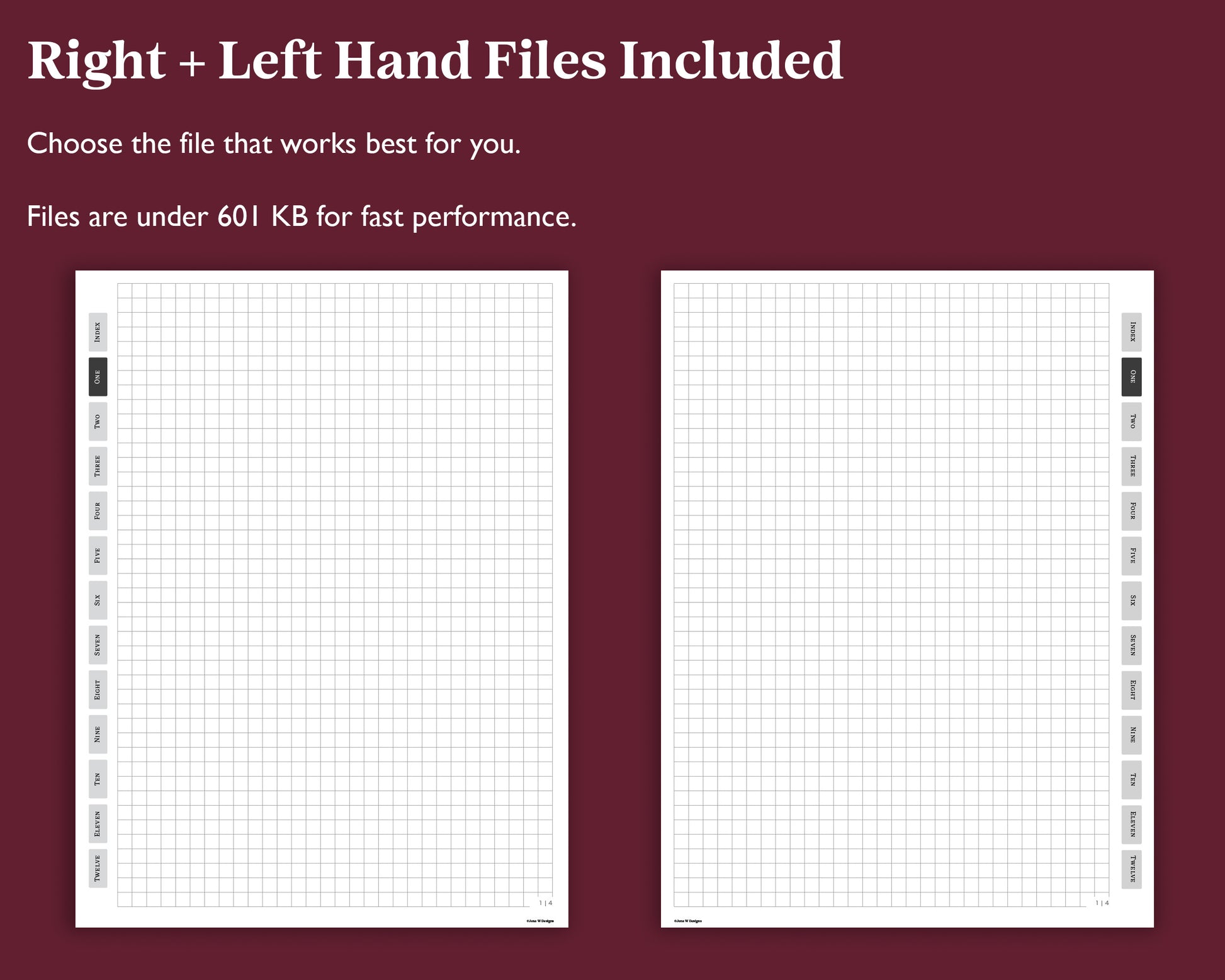 This high-quality pdf planner has a small file size of under 601 KB. Left and right-handed versions are included.