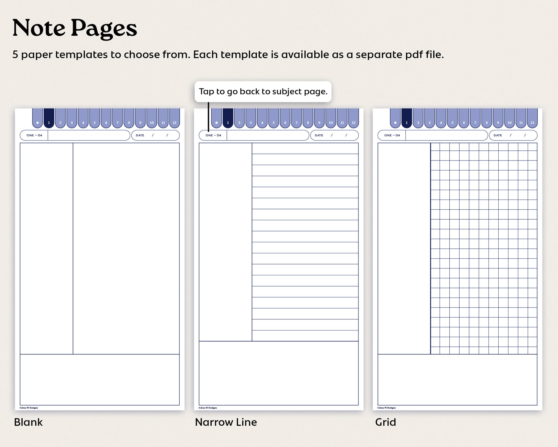 With 12 custom sections and 20 linked pages per section, you'll have 240 pages to capture your ideas with ease. Choose from five Cornell paper templates (blank, narrow rule, wide rule, dotted, and grid) to match your note-taking style. Each section is clearly labeled and designed for fast, seamless navigation, ensuring you stay focused on what matters most.