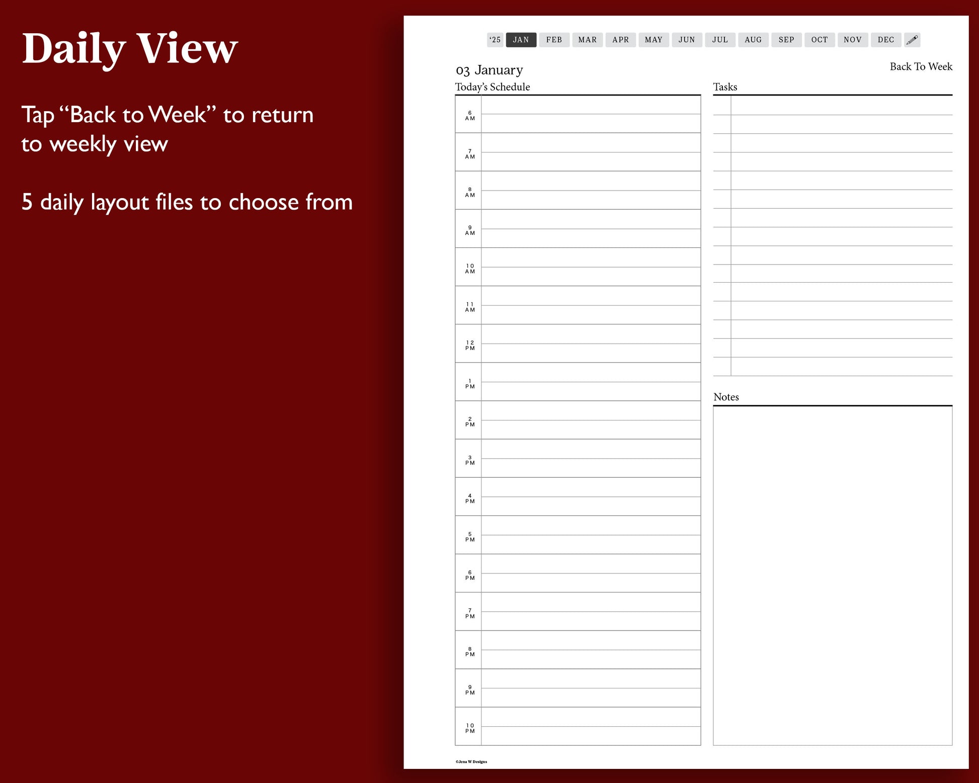 - 5 daily layout options included: schedule with time, schedule without time, blank, wide lines, and narrow lines