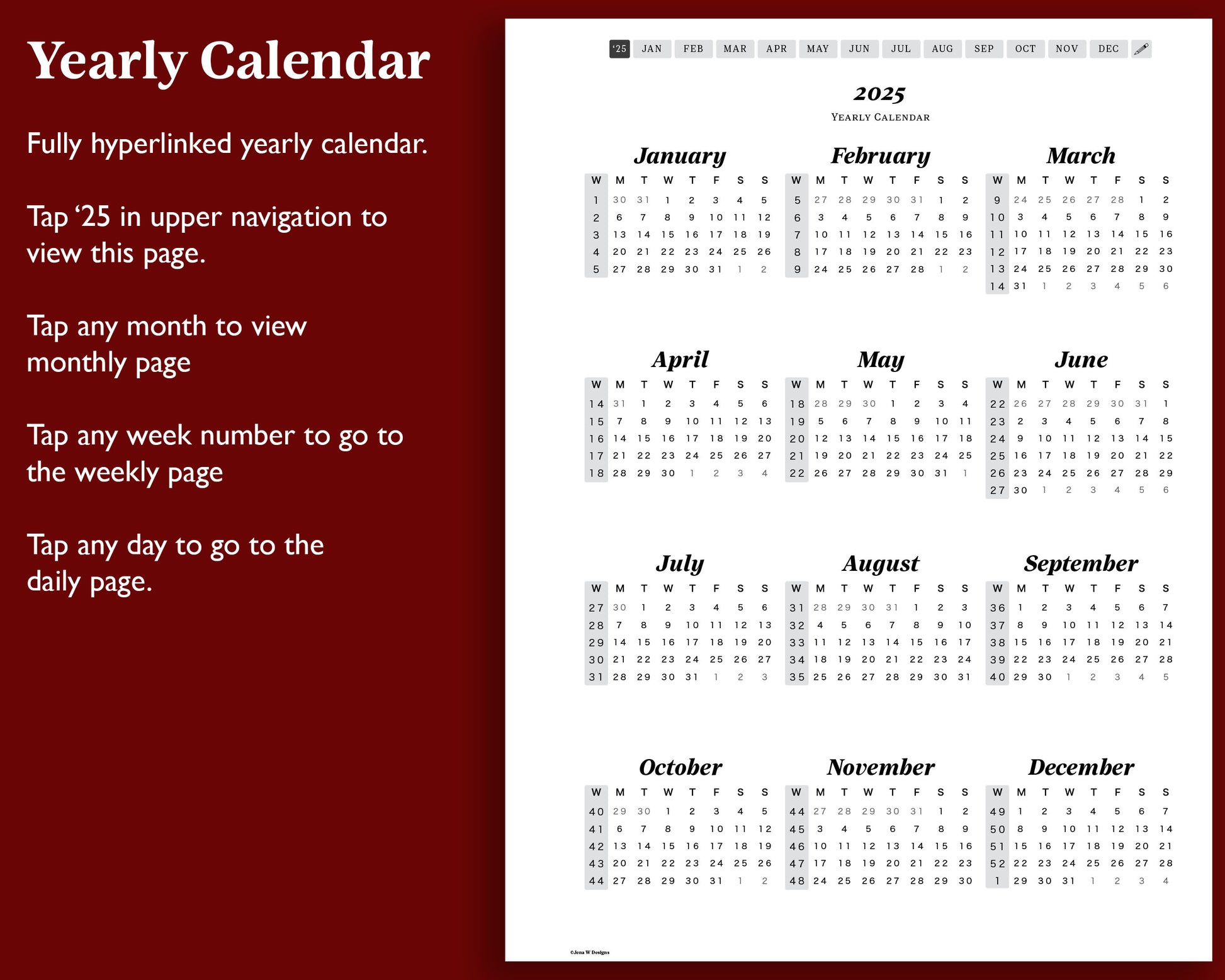- Hyperlinked yearly calendar dated for 2025