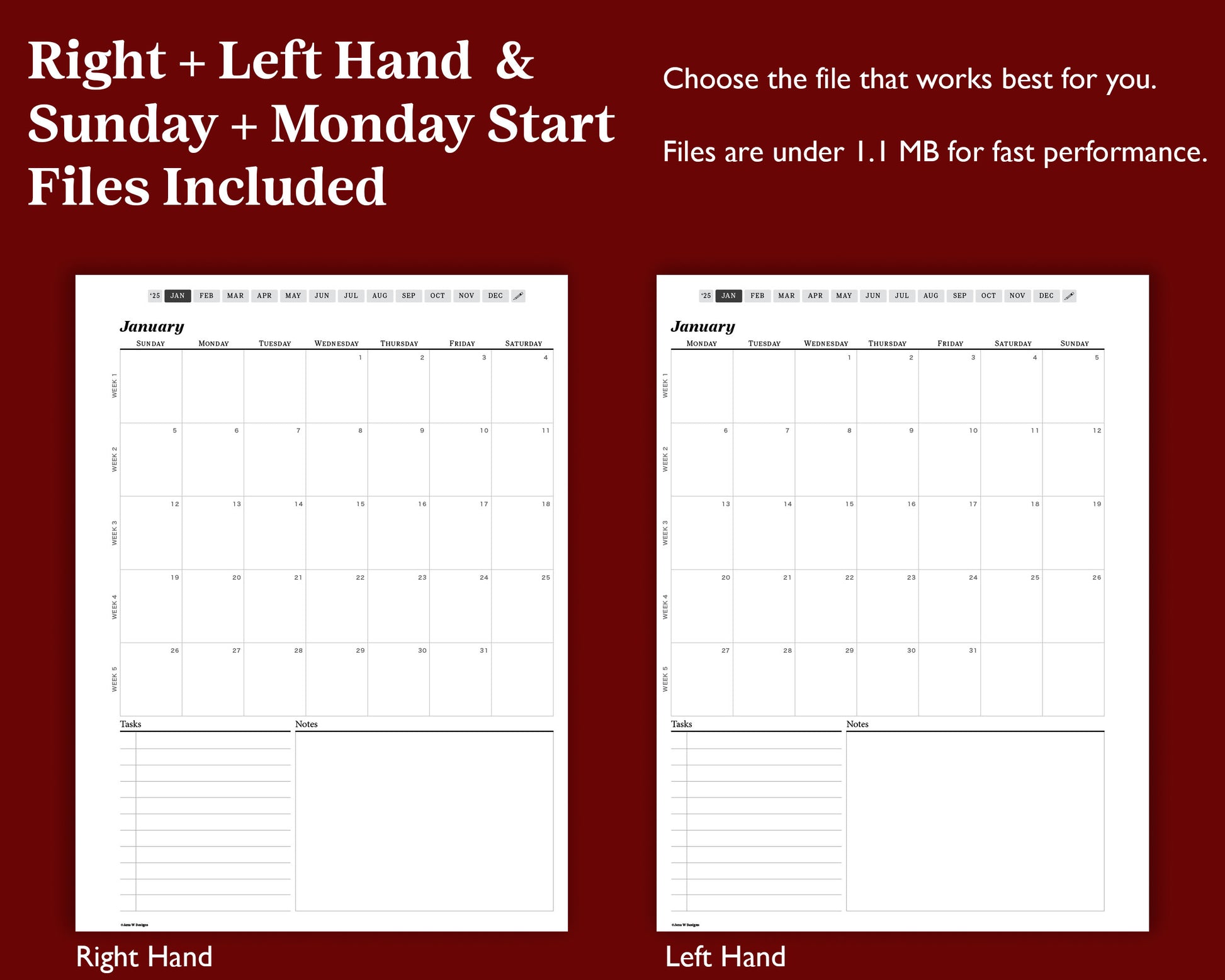 This high-quality pdf planner has a small file size of under 1.1 MB. Left and right-handed versions, Sunday and Monday start dates are all included.