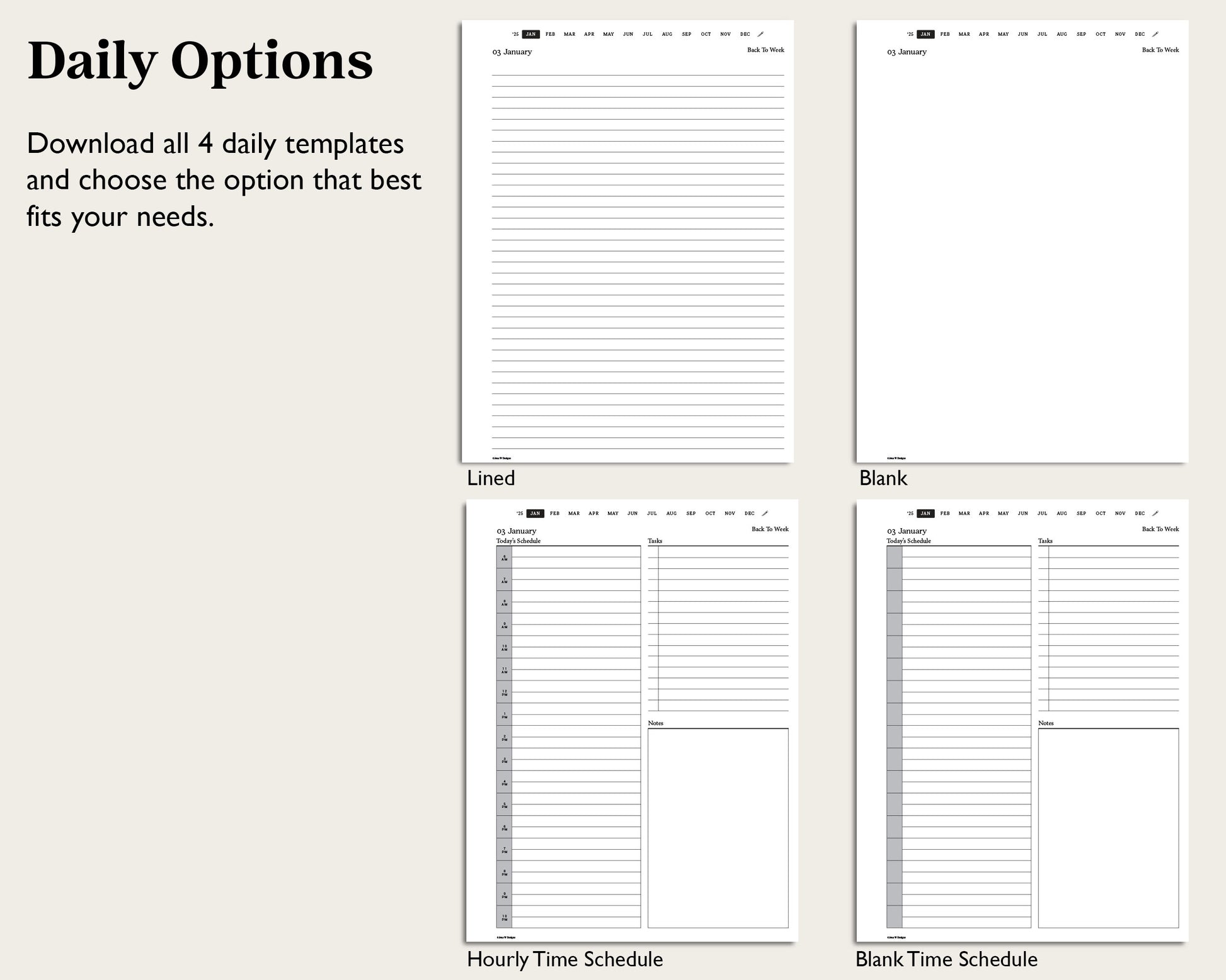 - 4 daily layout options included: schedule with time, schedule without time, blank, and narrow lines