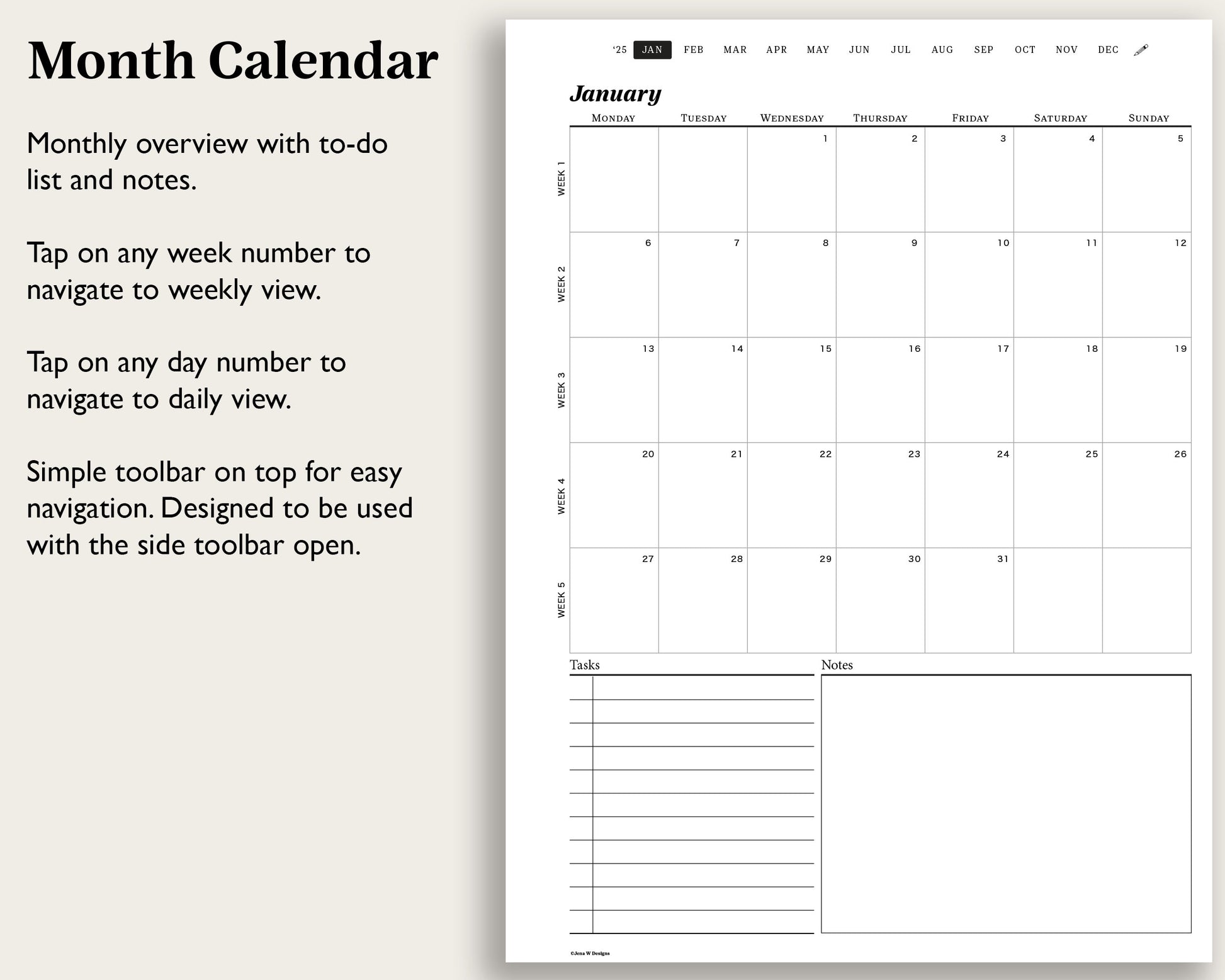 Plan your monthly, weekly and daily tasks with a simple and functional digital planner compatible with the reMarkable Paper Pro e-ink tablet.