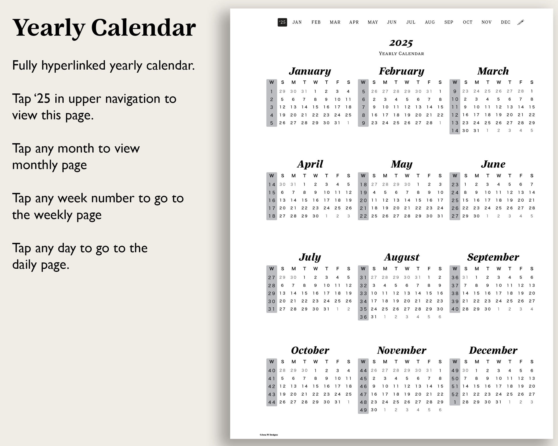 This high-quality pdf planner has a small file size of under 1.1 MB. Left and right-handed versions, Sunday and Monday start dates are all included.