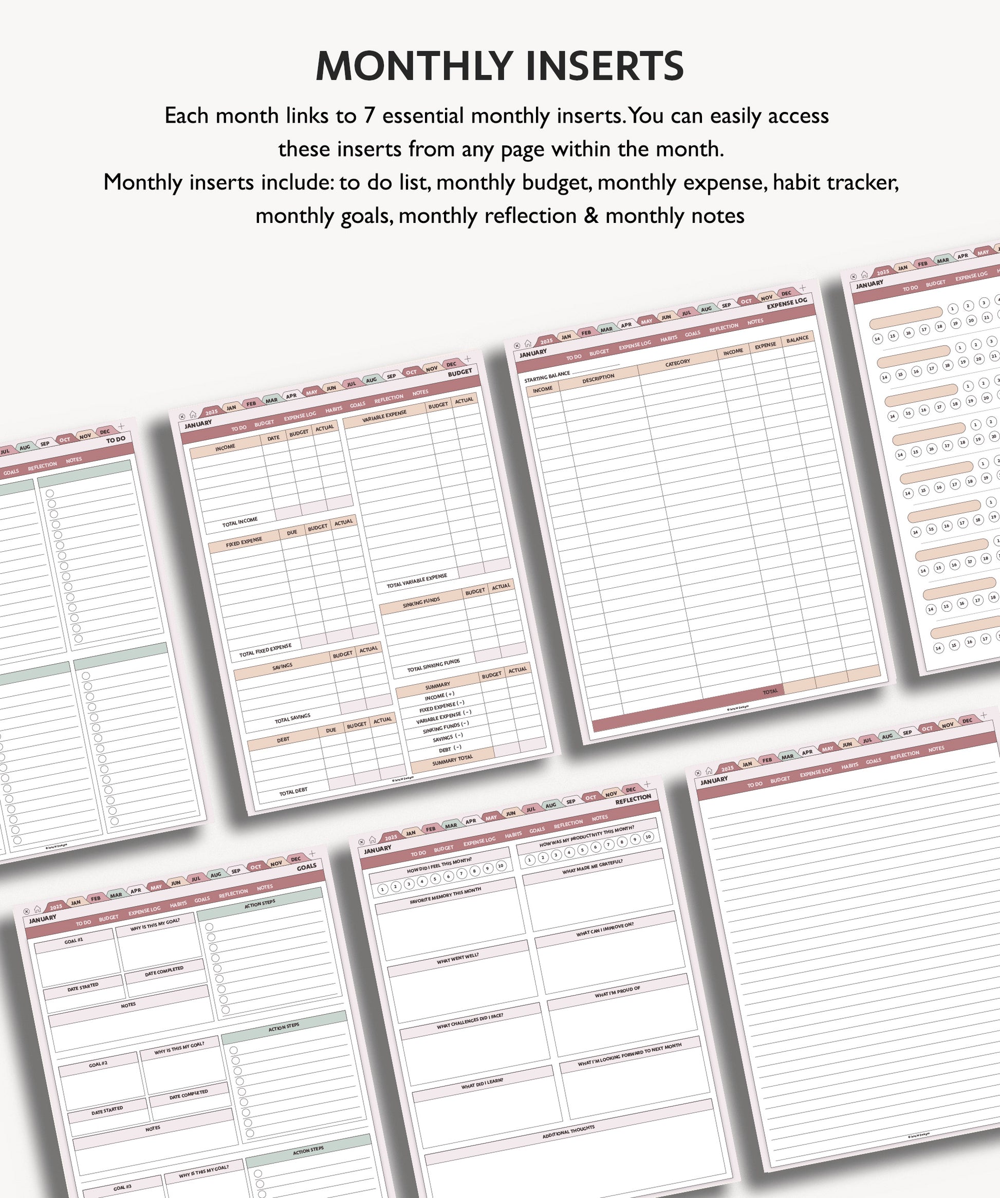 - Monthly inserts each month | To do list, monthly budget, expense tracker, habit tracker, monthly goals, monthly reflection, & monthly notes