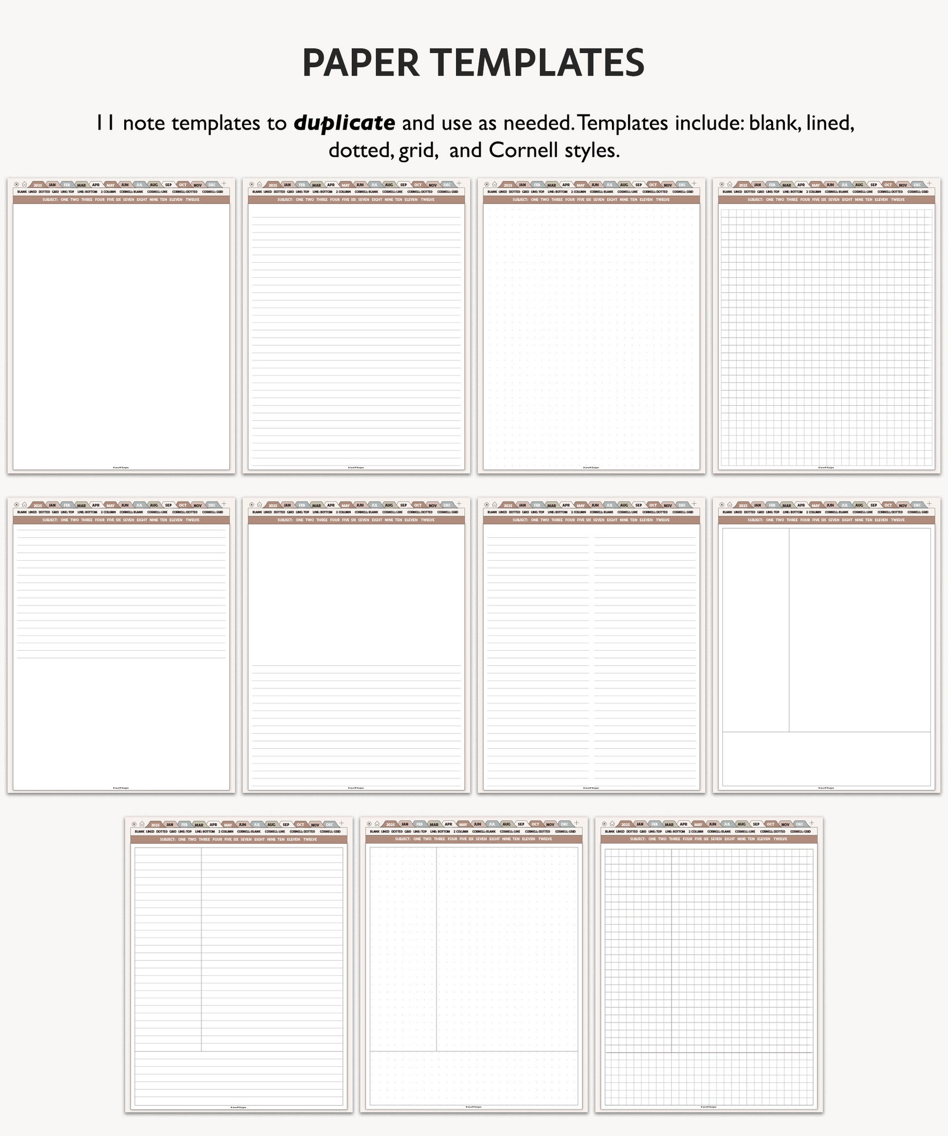 - 12 custom sections with 11 paper templates including: blank, lined, dotted, grid, & Cornell styles