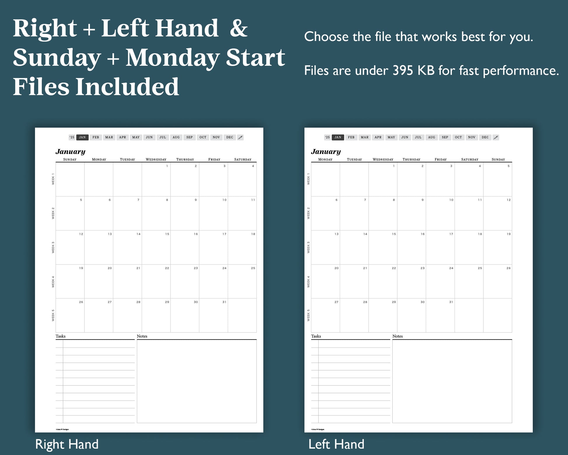 This high-quality pdf planner has a small file size of under 395 KB. Left and right-handed versions, Sunday and Monday start dates are all included.