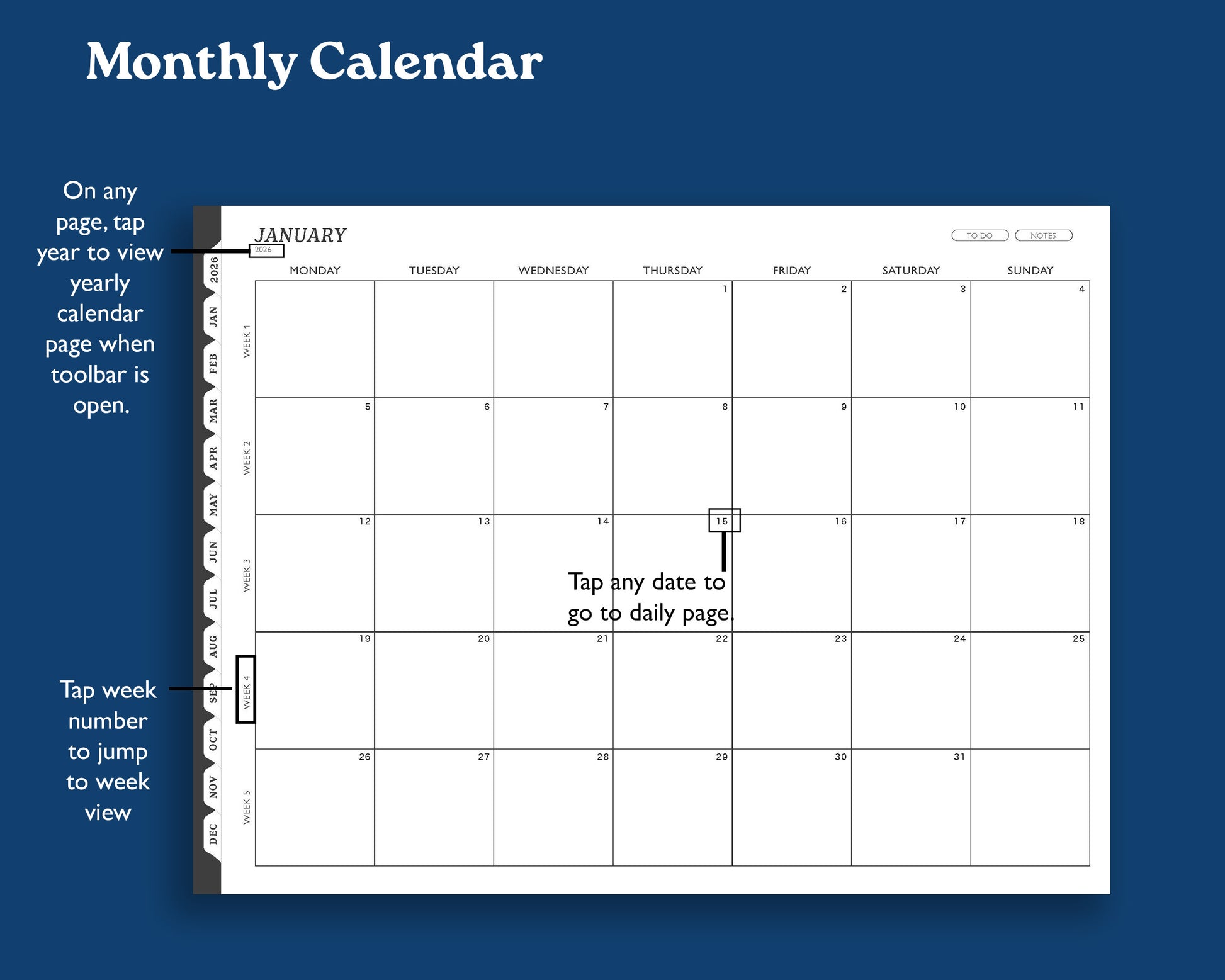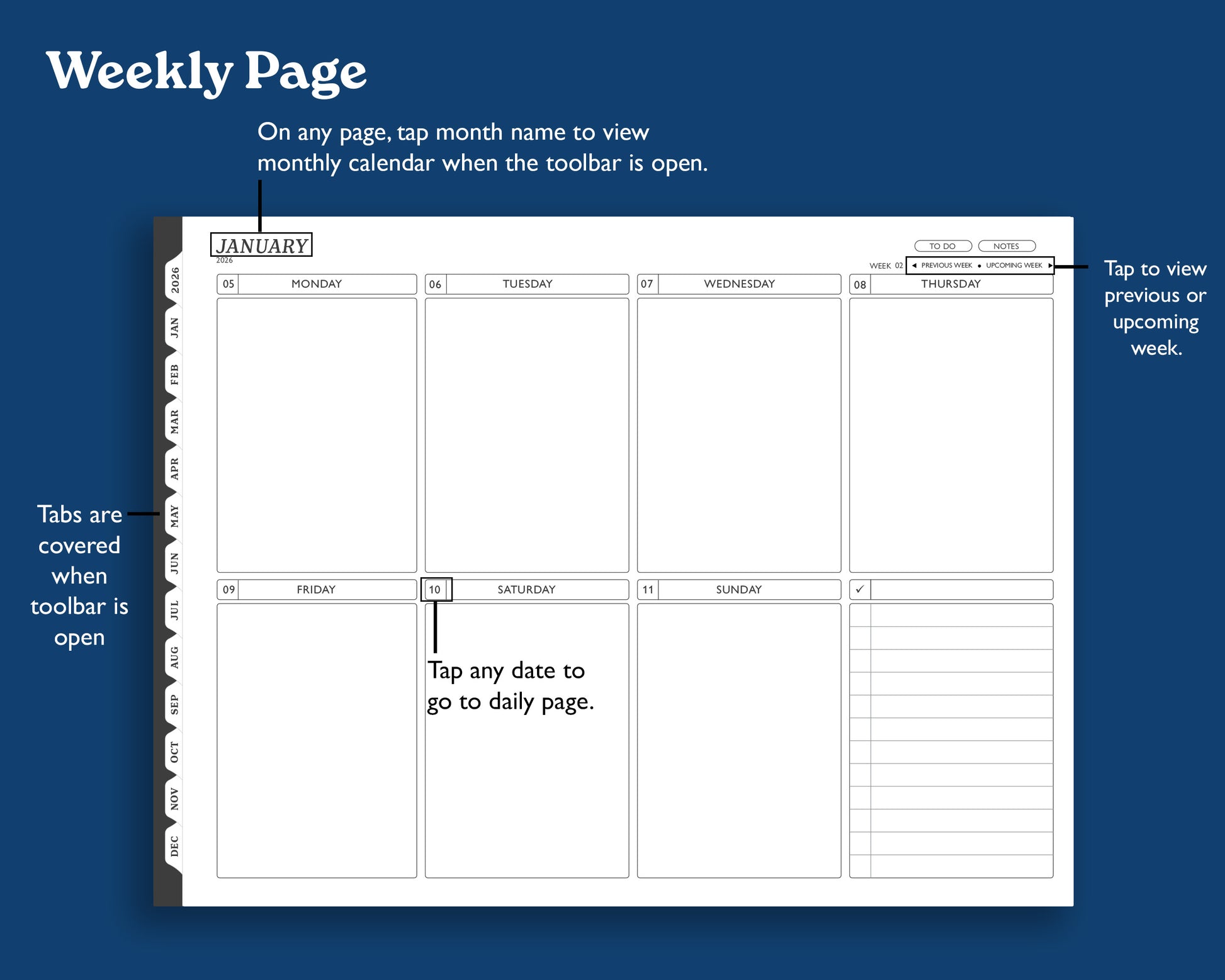 Keep track of your appointments, tasks, and thoughts with a simple and clean dated 2026 monthly weekly, and daily calendar. This digital agenda is designed to use the maximum space on your tablet.
