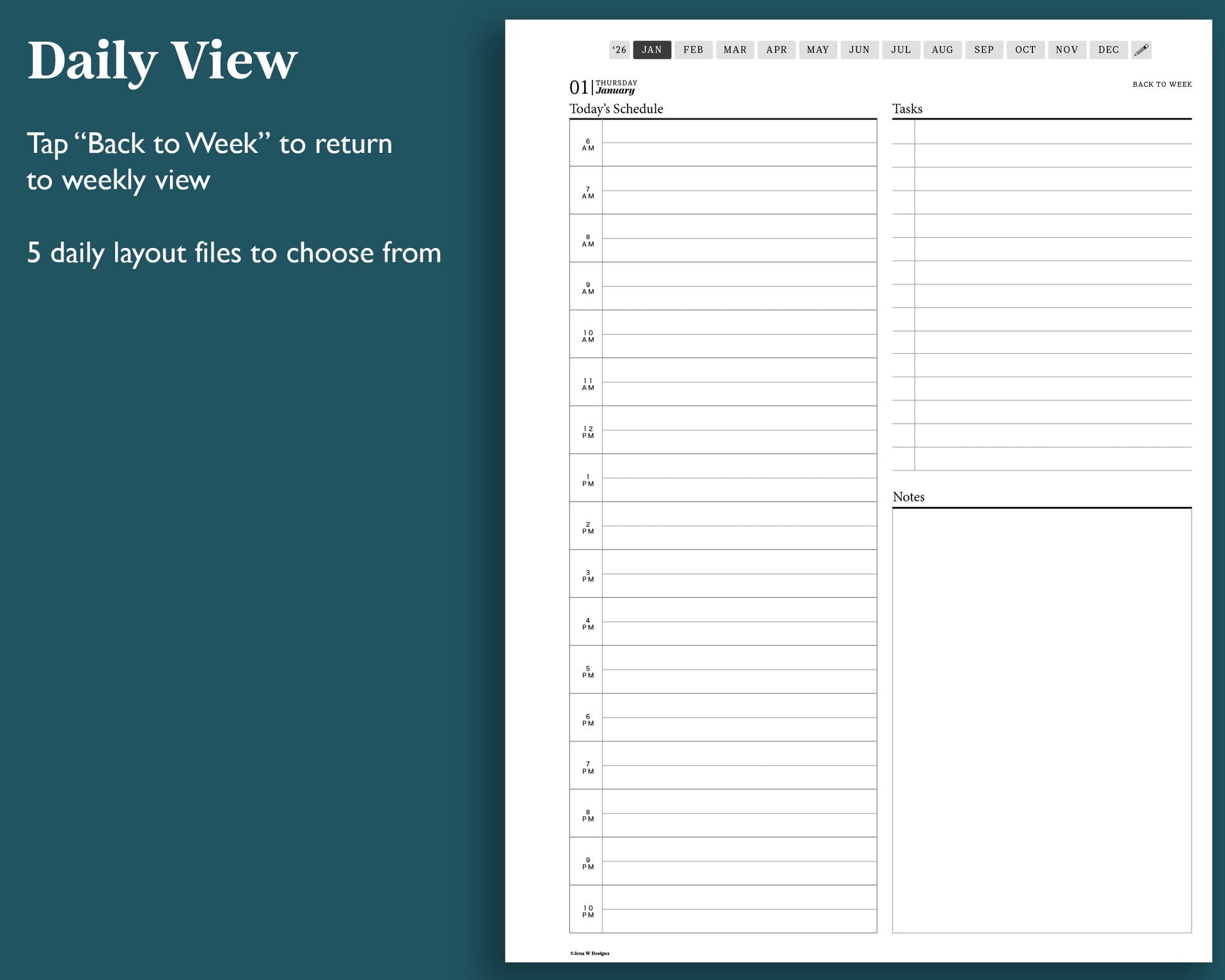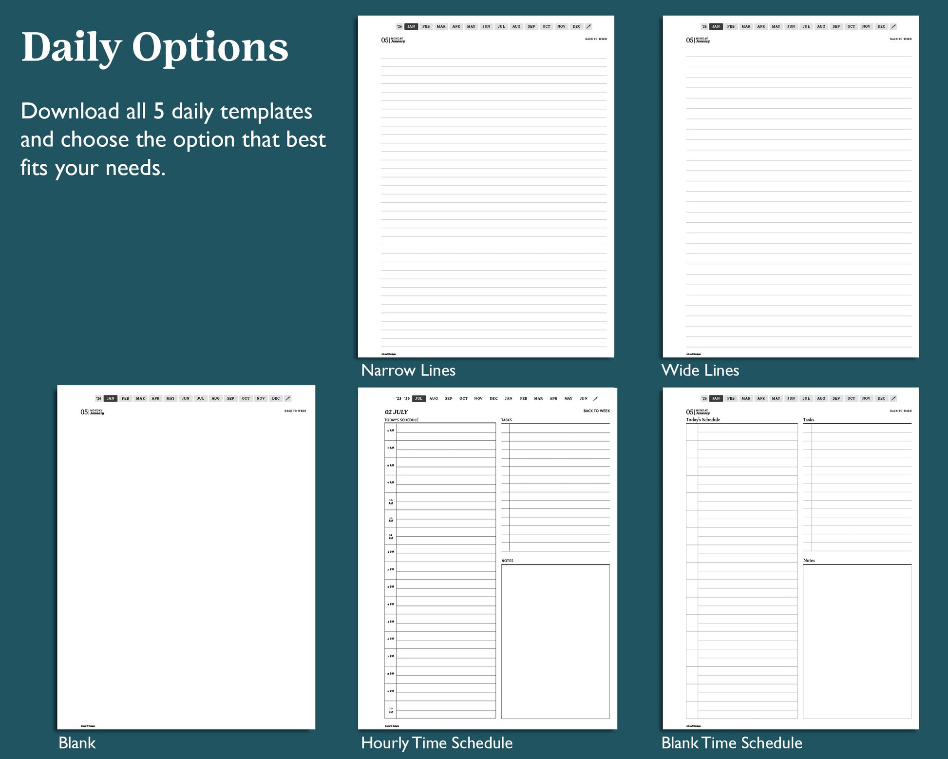 - 5 daily layout options included: schedule with time, schedule without time, blank, wide lines, and narrow lines