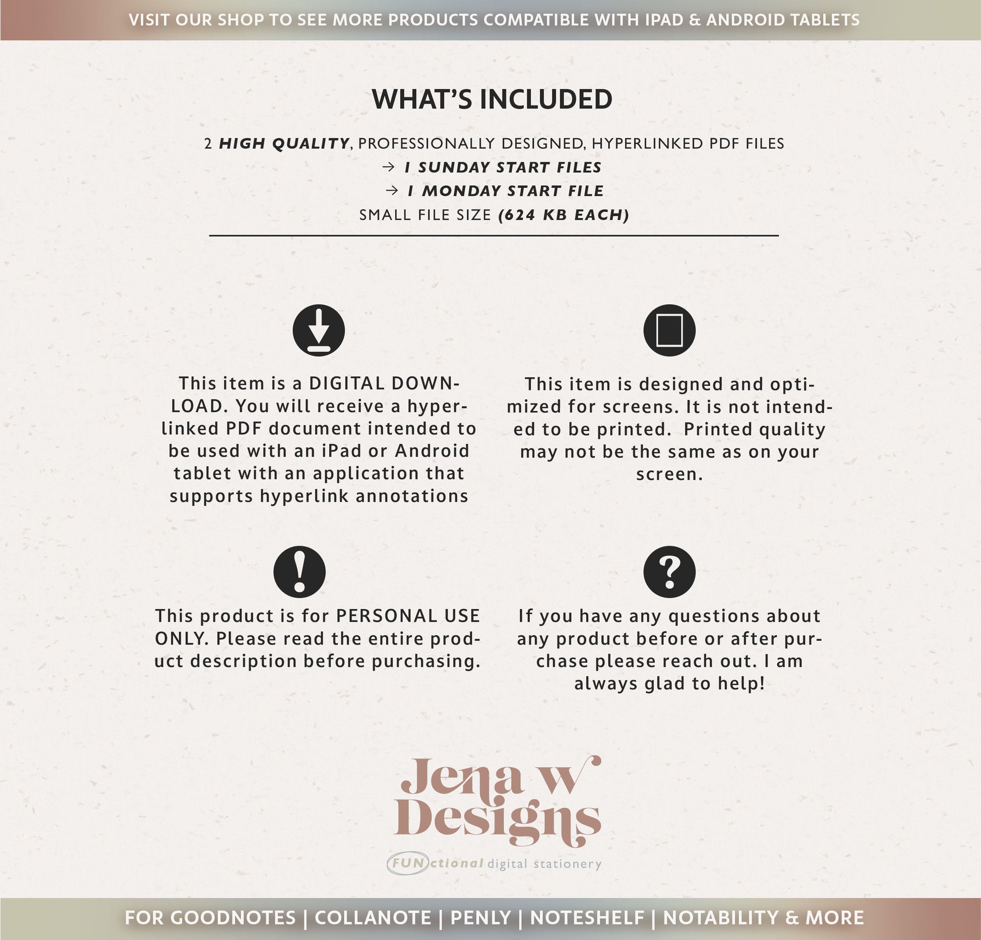 - 2 hyperlinked pdf files of your digital planner ( 1 Sunday and 1 Monday Start) to use in your preferred annotated hyperlink app such as GoodNotes. Review the compatibility tab if you would like to learn more about apps that work with digital pdf templates.