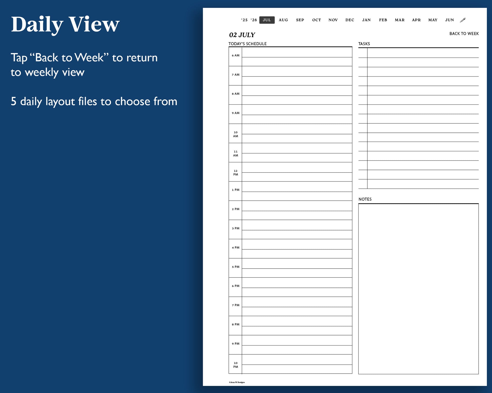 - 5 daily layout options included: schedule with time, schedule without time, blank, wide lines, and narrow lines