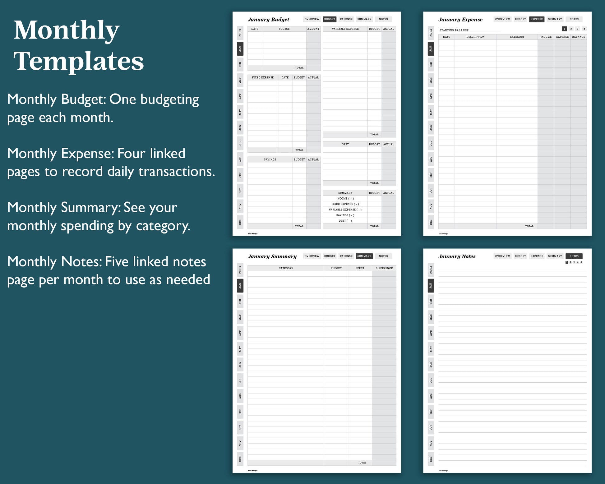 - Monthly pages include: Month overview, month budget, expense tracker, monthly summary and 5 linked note pages