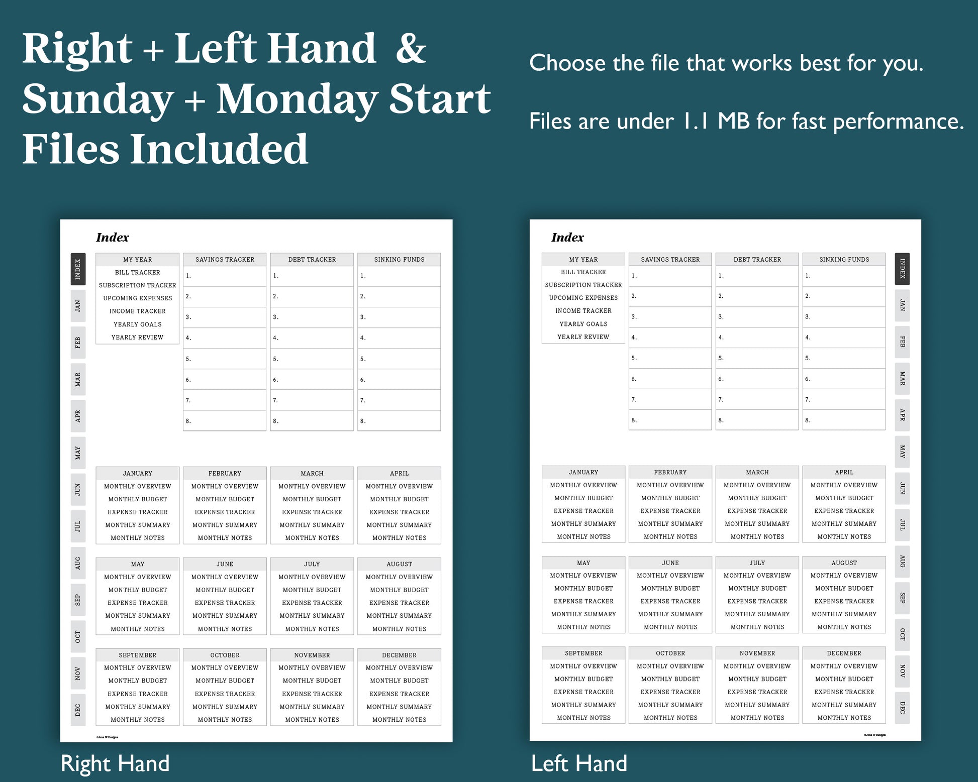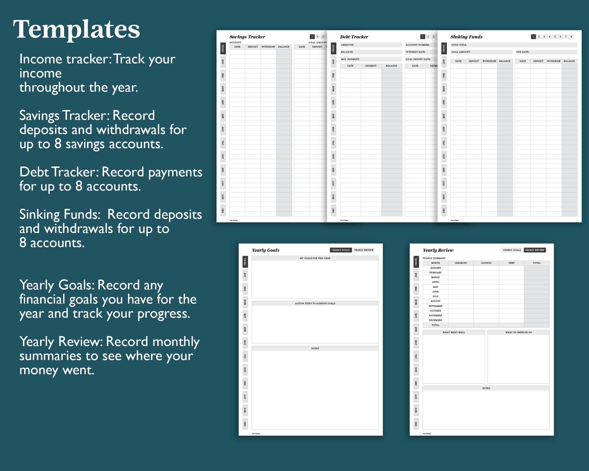 - Yearly pages including: bill tracker, subscription tracker, upcoming expenses, income tracker, yearly goals, year review, 8 savings account trackers, 8 debt account tracker, 8 sinking funds