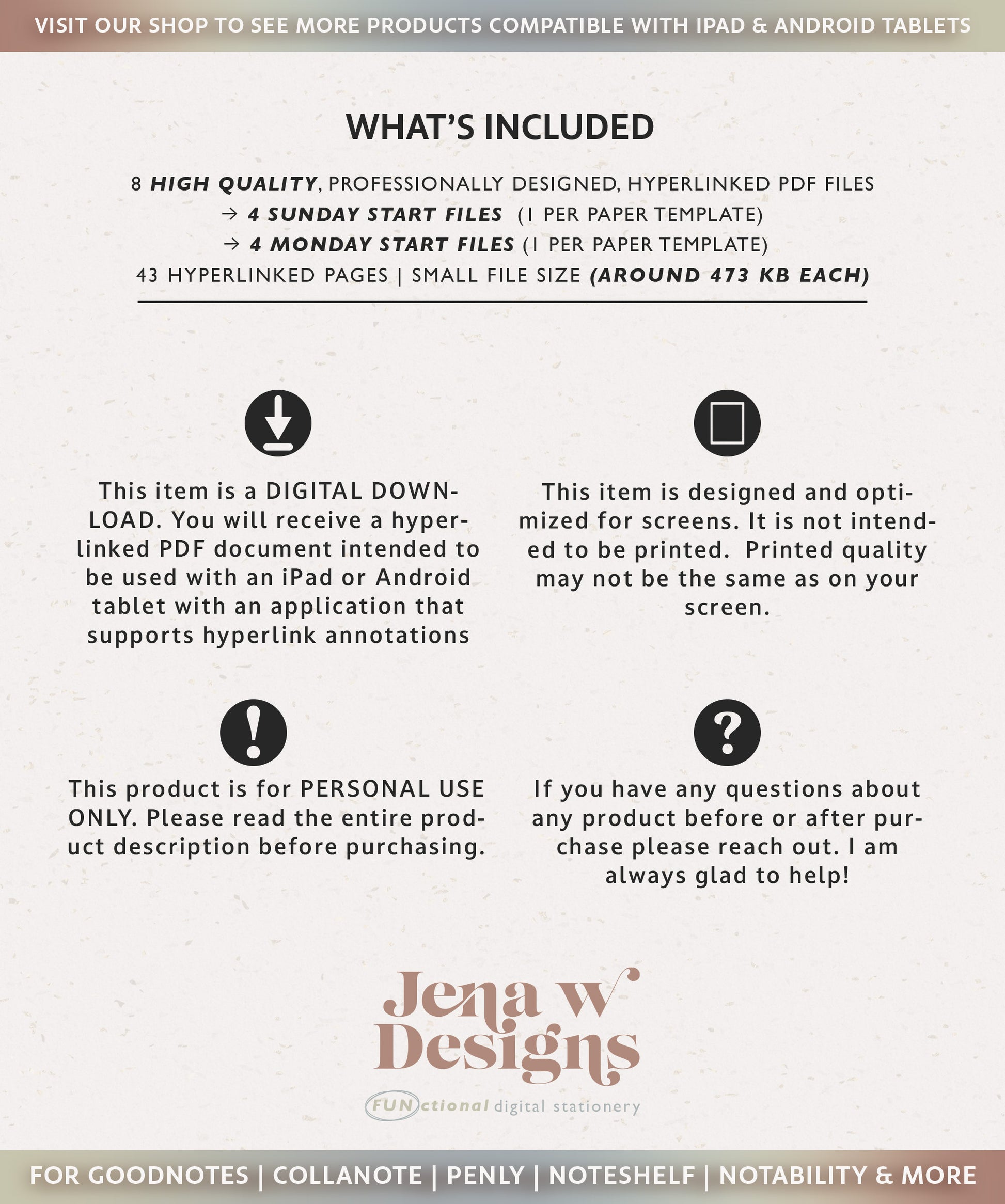 - 8 hyperlinked pdf files of your digital planner ( 4 Sunday and 4 Monday Start) to use in your preferred annotated hyperlink app such as GoodNotes. Review the compatibility tab if you would like to learn more about apps that work with digital pdf templates.