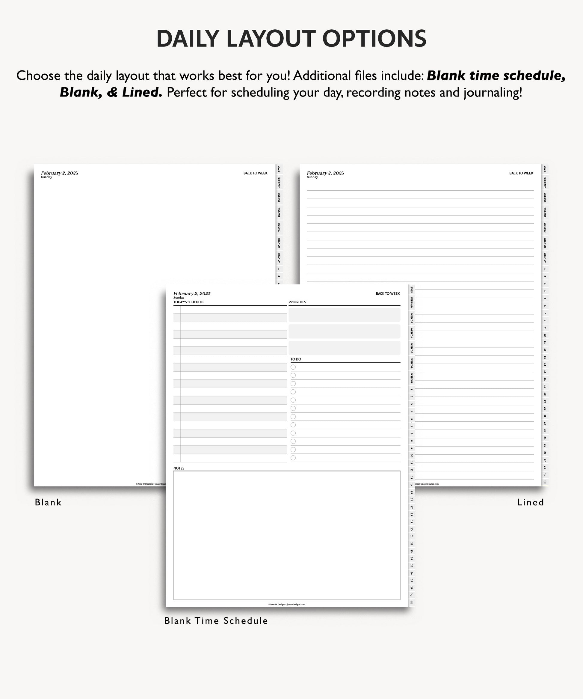 - Multiple Daily Layouts – Choose from hourly time schedule, blank, or lined pages