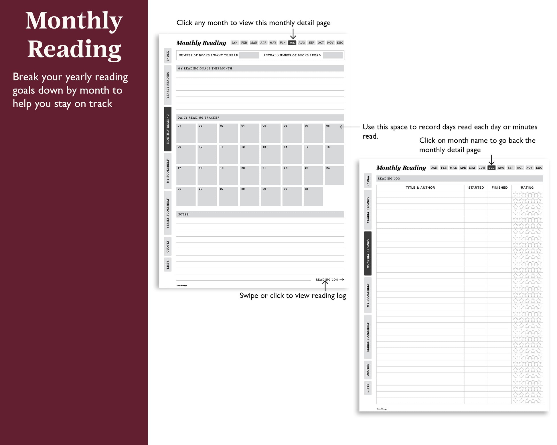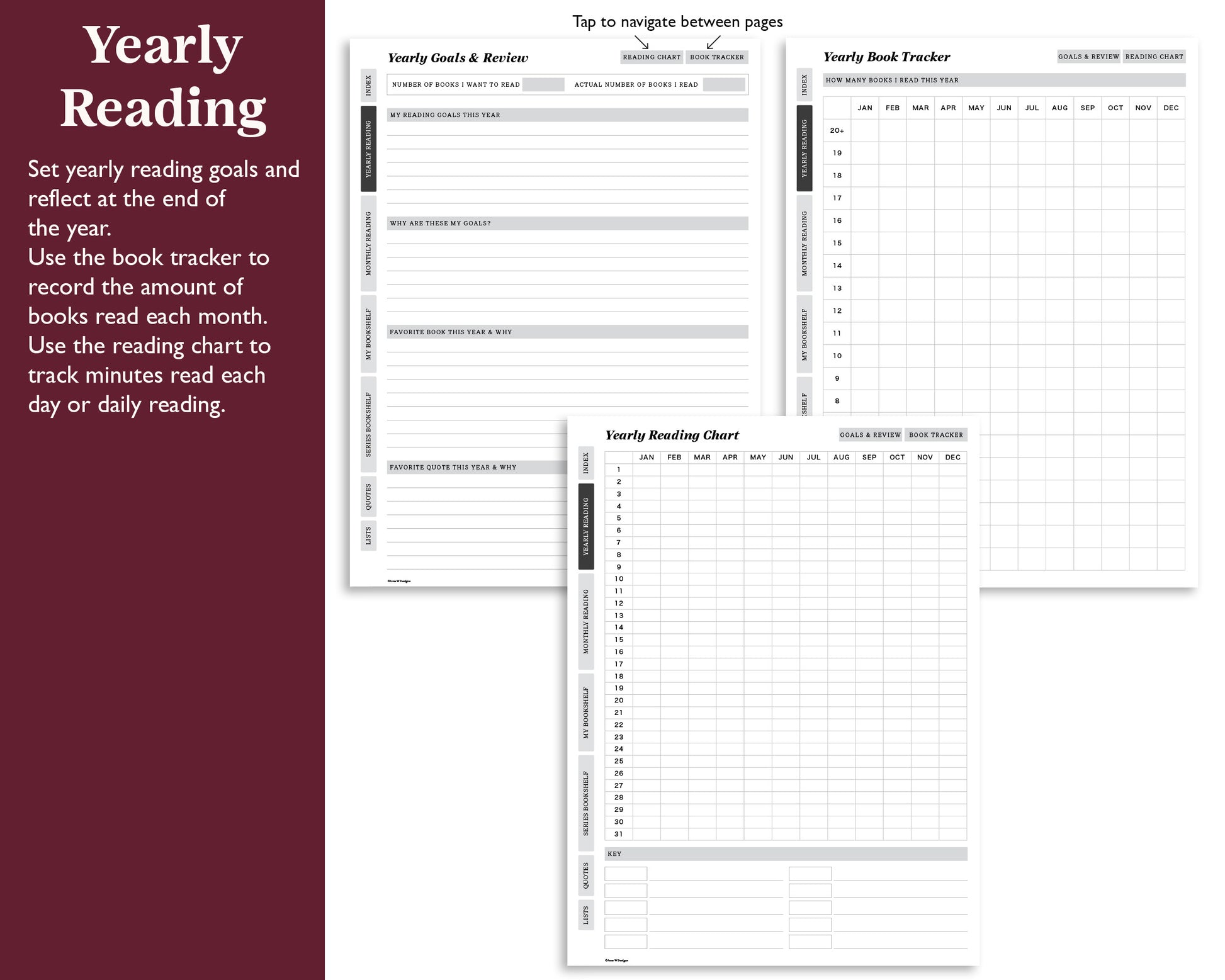 - Monthly and Yearly reading pages to track minutes read, books read, reading goals and more