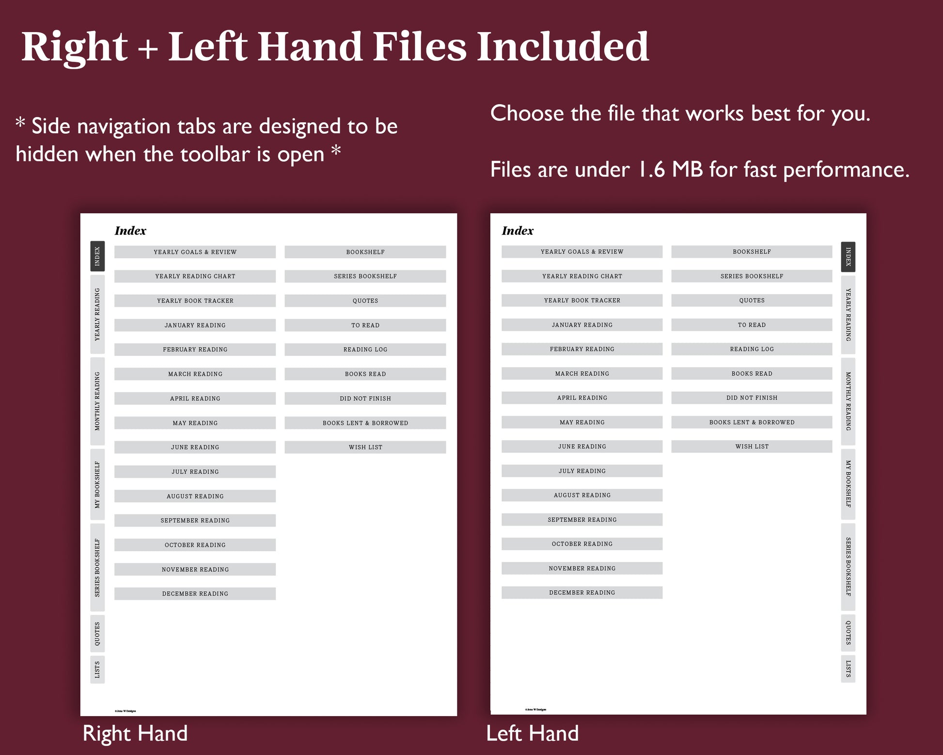 This high-quality pdf planner has a small file size of under 1.3 MB. Left and right-handed versions are included.