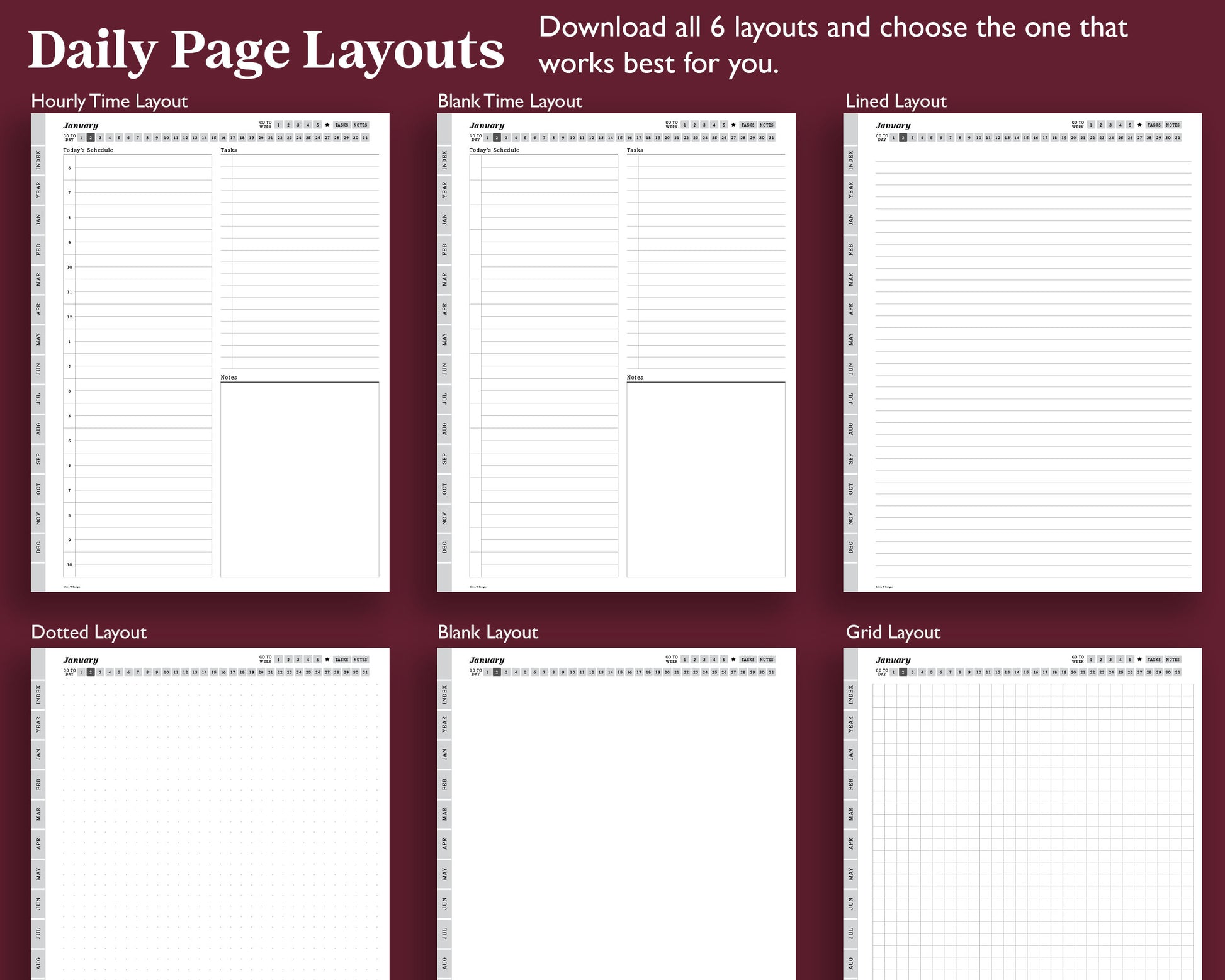 - 6 daily layout options included: schedule with time, schedule without time, blank, grid, lined & dotted