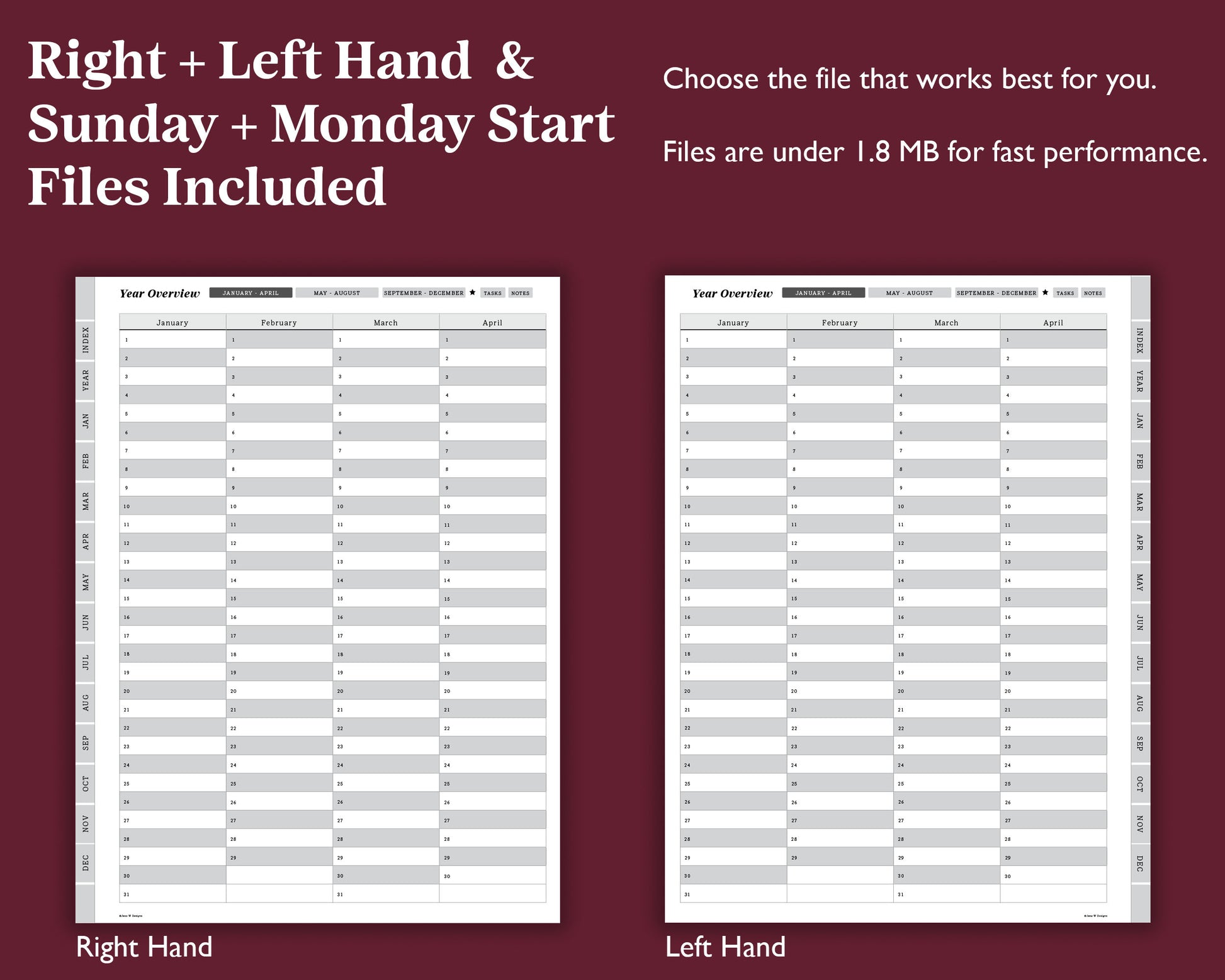 This high-quality pdf planner has a small file size of under 1.8 MB. Left and right-handed versions are included.